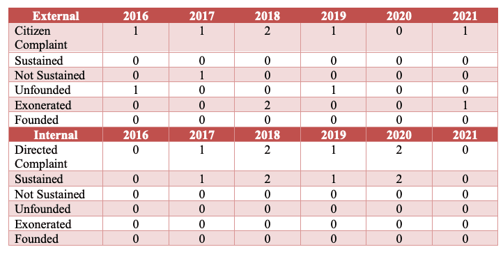 The Lake Zurich Police Department follows an internal affairs policy to ensure prompt and thorough investigation of alleged transgressions and, if needed, take appropriate disciplinary action. During 2025, there were no incidents which required internal investigations. Incidents may be initiated by either an external or internal complaint. During 2025, there were three citizen complaints made against Lake Zurich police officers.