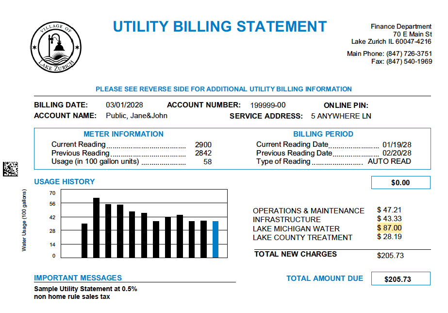 Sample 2028 utility bill with a 1% local sales tax (you save $5 per 1000 gallons)